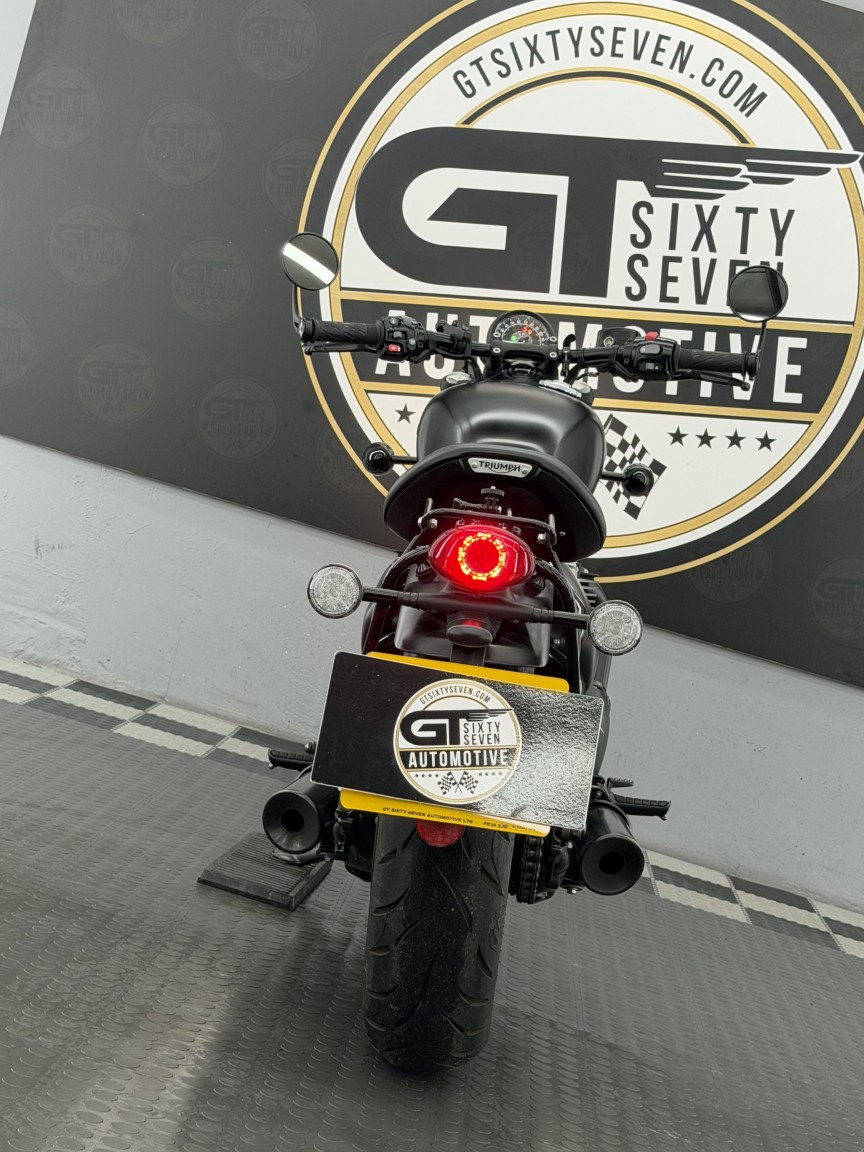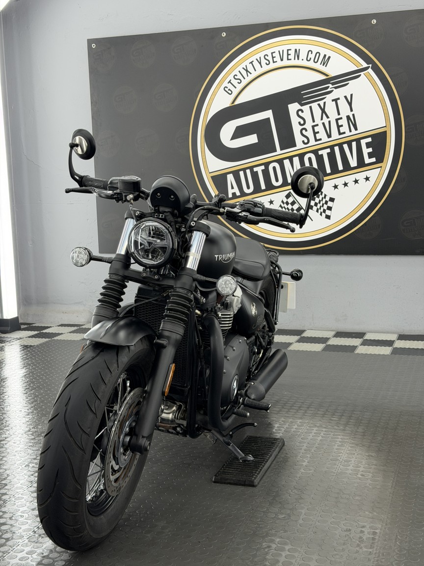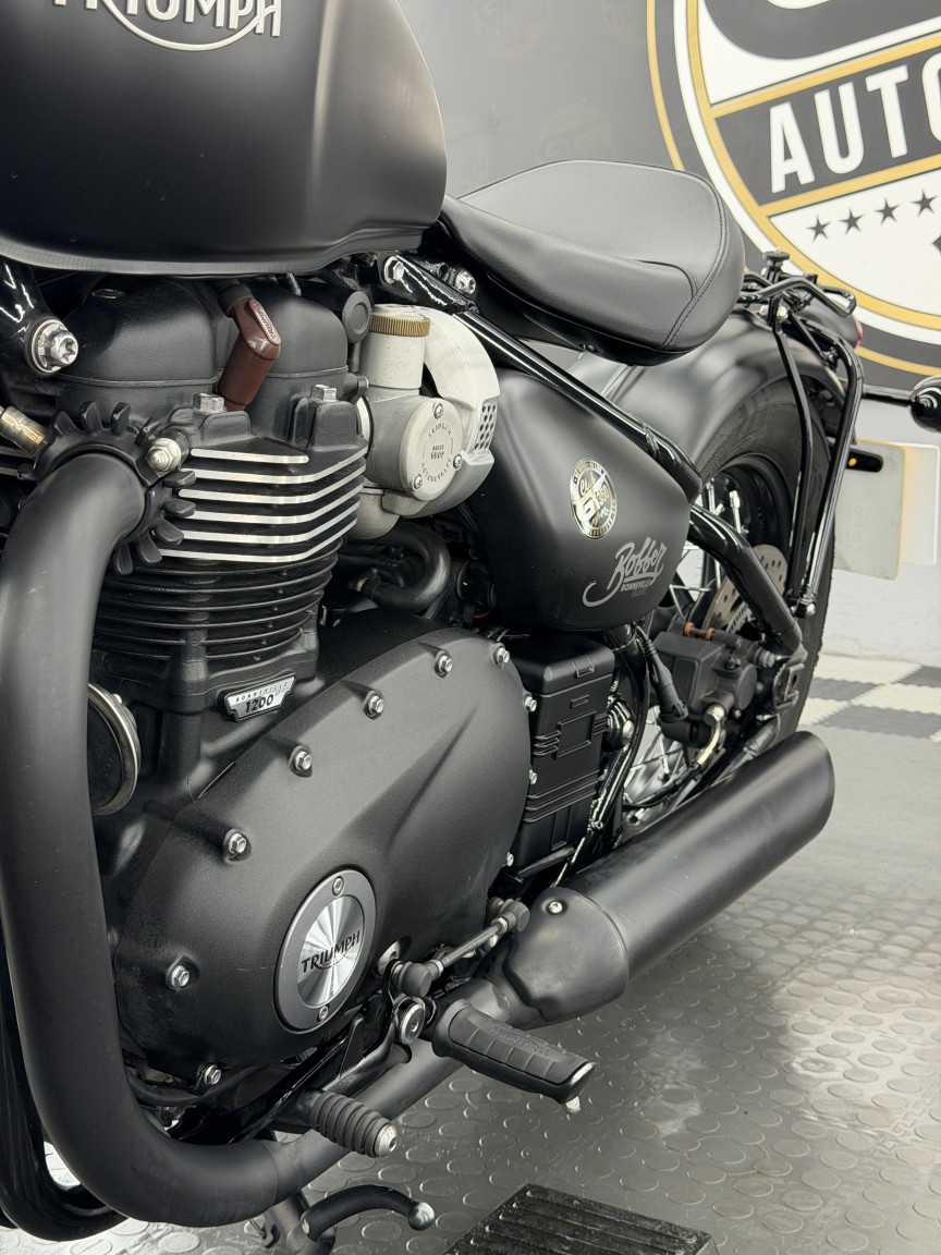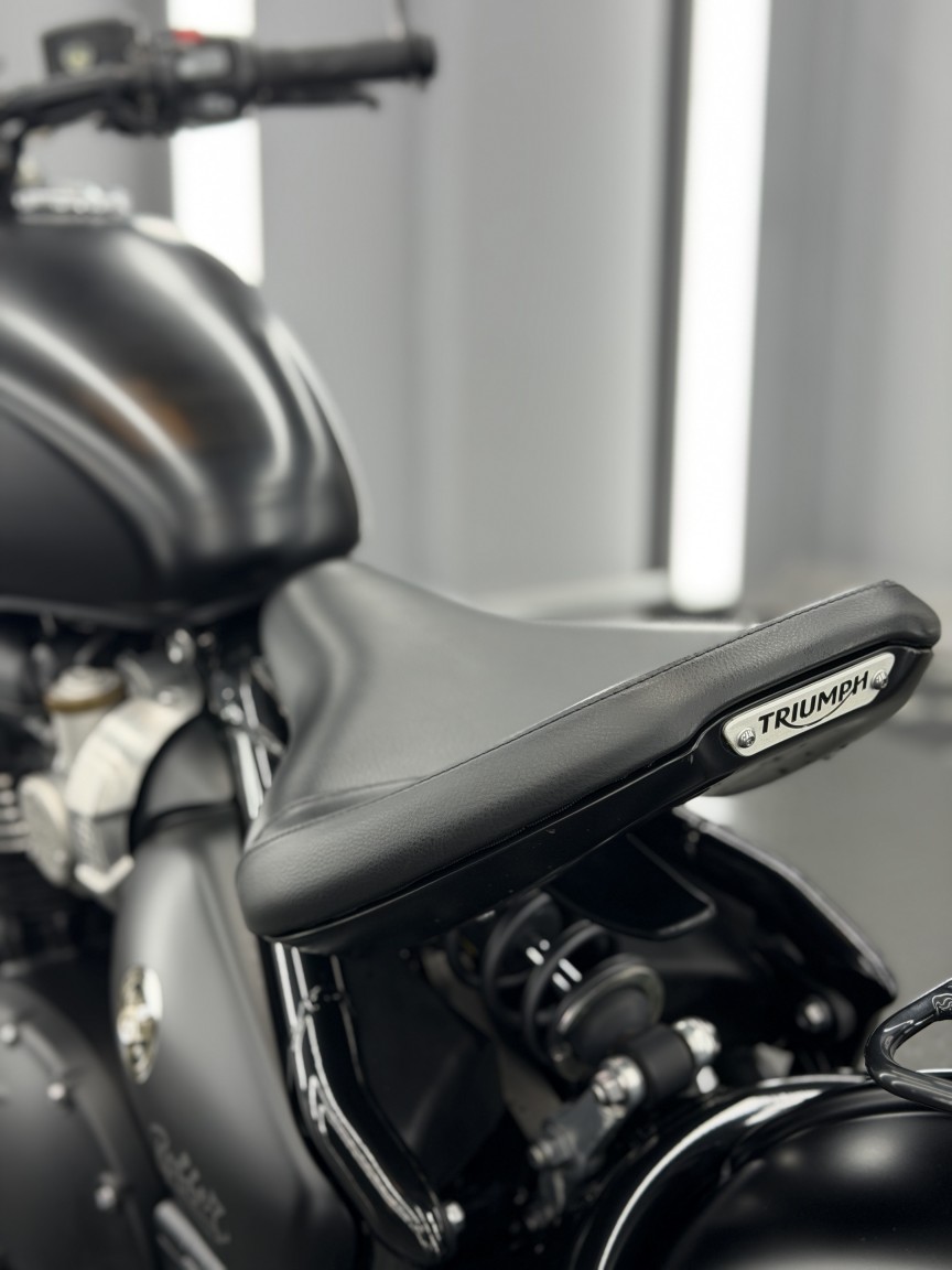 We are absolutely thrilled to be able to offer this stunning British Motorcycle out to the market! This example of a 2018 Triumph Bonneville Bobber Black 1200 is finished in Matte Black & has covered just 5,300 miles from new. It has been owned by our director since 2022 & has enjoyed just 1600 miles of dry weather use in those 4 years & dry stored. The visual design of the Bobber Black is just pure wonderful stripped back nostalgia, with its gorgeous floating single seat & spoked wheels. The Triumph engineers also built in some neat features including ride modes, ABS & 1 touch cruise control. A small but notable aftermarket addition is the rear mudguard luggage rack in Gloss Black, turning it into a bike that can actually then tour, and look damn good whilst it does it!